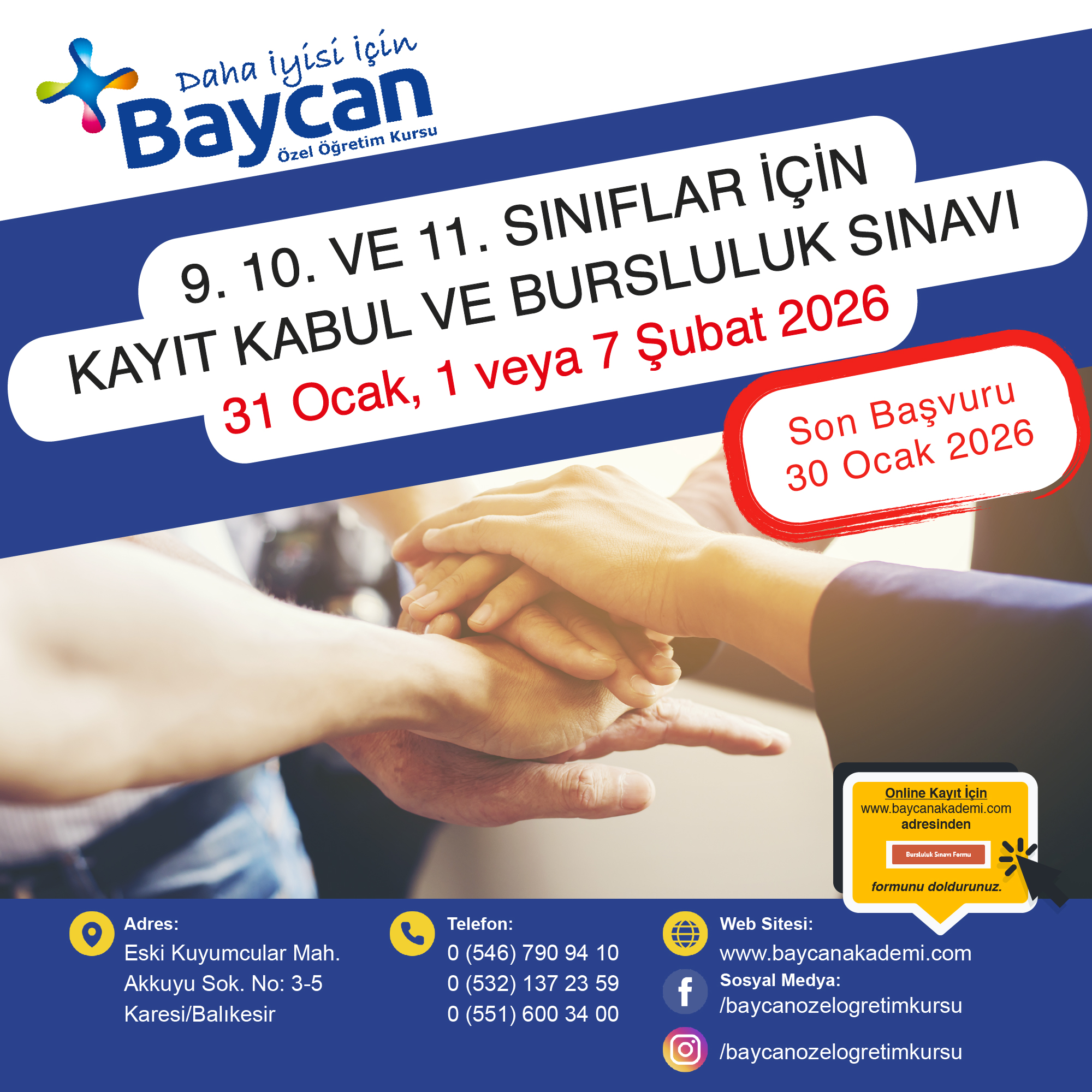 Kabul ve bursluluk sınavı, en fazla 13 kişilik sınıflarda tekli oturma düzenine uygun gruplar halinde yüz yüze gerçekleştirecektir. Son başvuru tarihi 06 Şubat 2026 Cuma günüdür. 5, 6, 7, 9, 10 ve 11. sınıf öğrencileri sınava ücretsiz katılabileceklerdir. Kabul ve bursluluk sınavına giriş için aşağıdaki formu doldurabilirsiniz. Lütfen duyurularımızı takip ediniz.